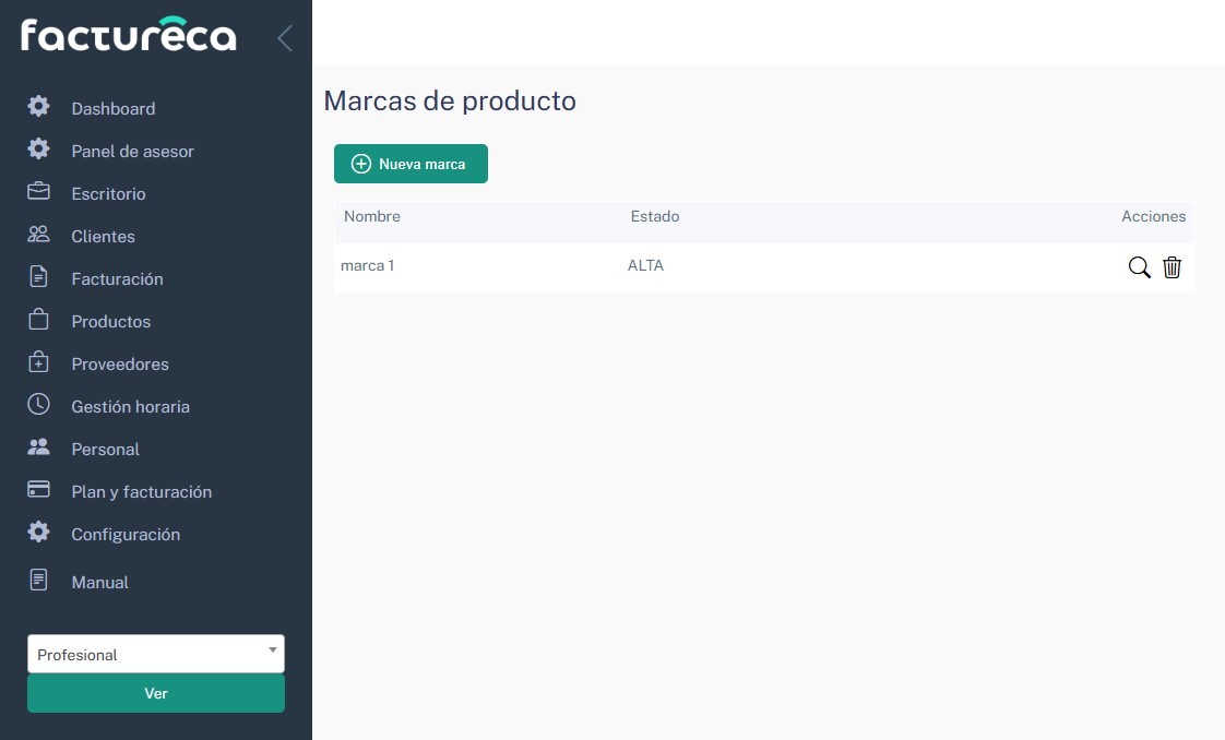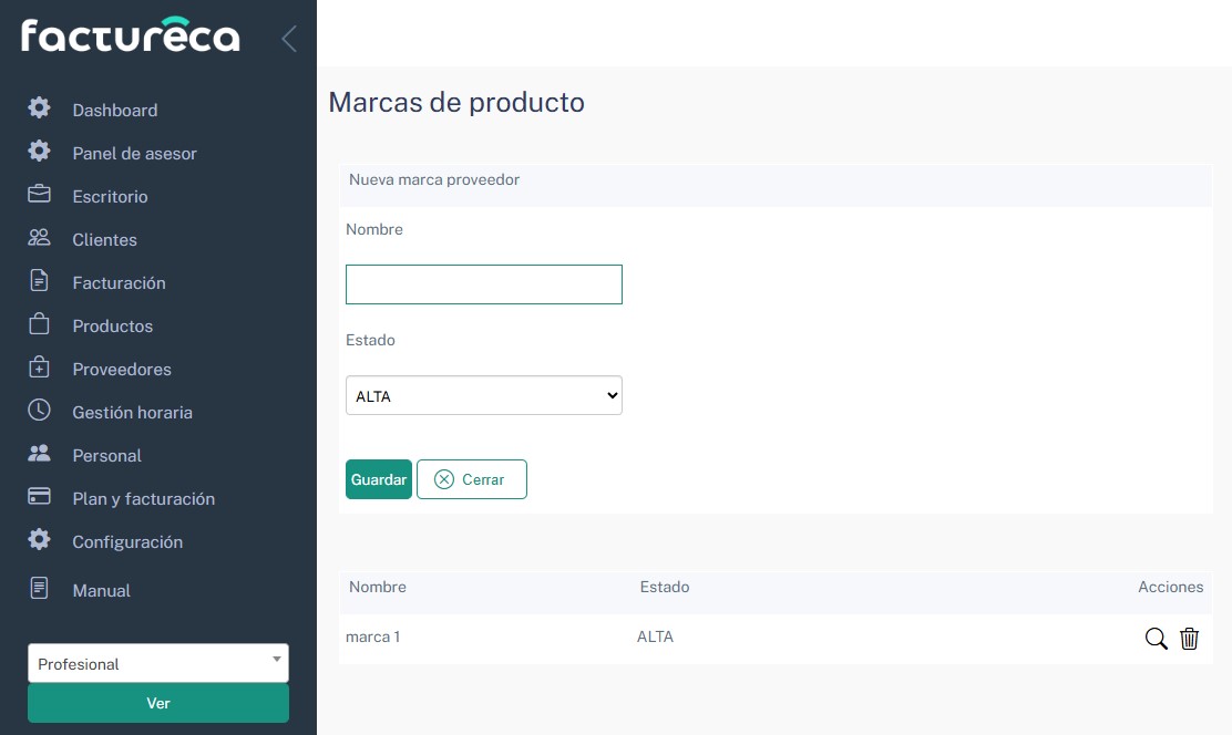 Pulsando en Nueva marca podremos elegir el nombre de esta y su estado: ALTA/BAJA.