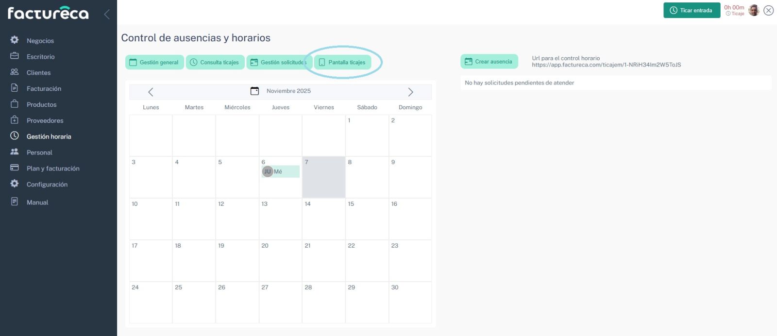 La cual nos llevaría a esta pantalla, donde se podrá marcar la entrada/salida de un trabajador: